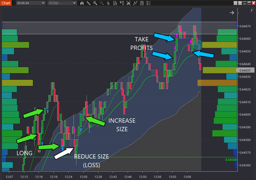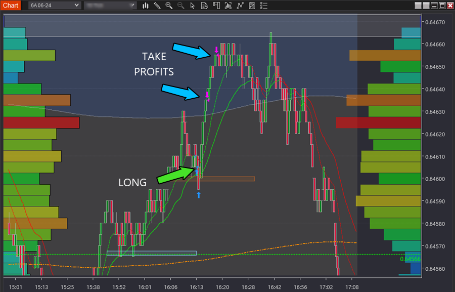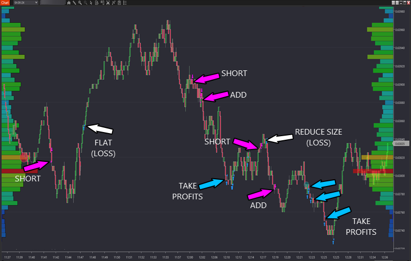 Similarly, the most successful market moves to trade are the unexpected moves that catch people off guard, using the element of surprise to gain an advantage. The pink arrow you see is the move down traded per the executions above—catching people off guard.