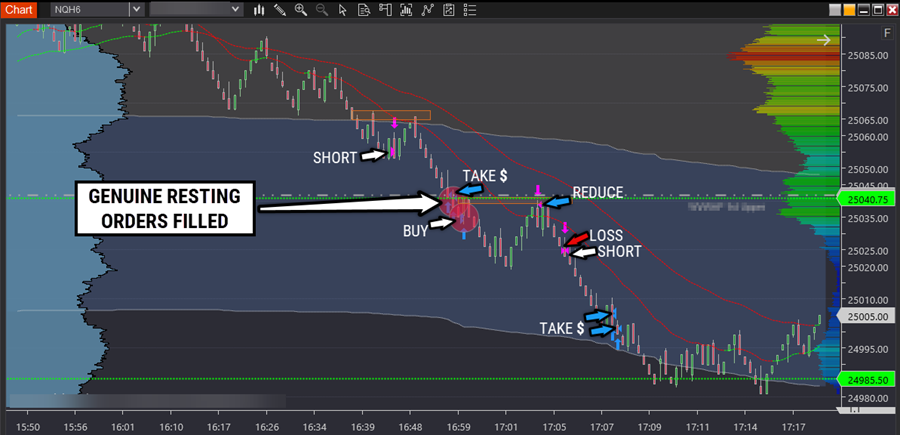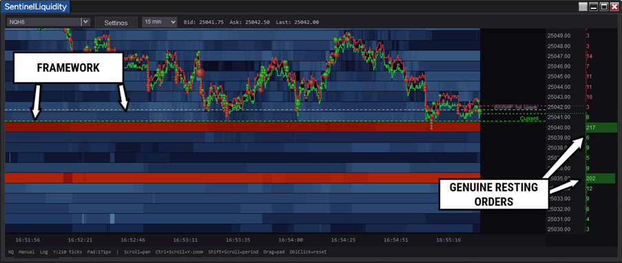 On the liquidity map below, you can see two large genuine resting orders. Knowing they're genuine and won't be pulled is a learnable skill.