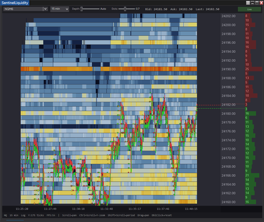 SentinelDOM to aggregate price, depth and volume - with volume split into custom periods because NQ in a sustained high-volatility regime isn't readable on a standard DOM.